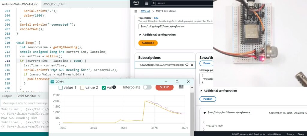 We take the average of 50 ADC samples from the MQ-2 sensor to ensure stable and reliable readings. This averaged sensor data is then published to AWS IoT Core on the topic: